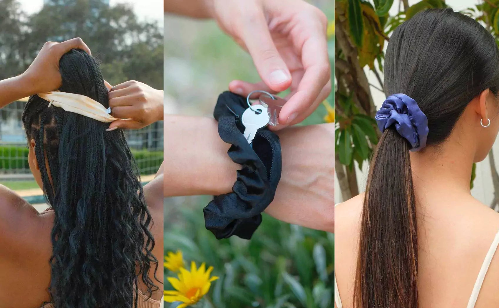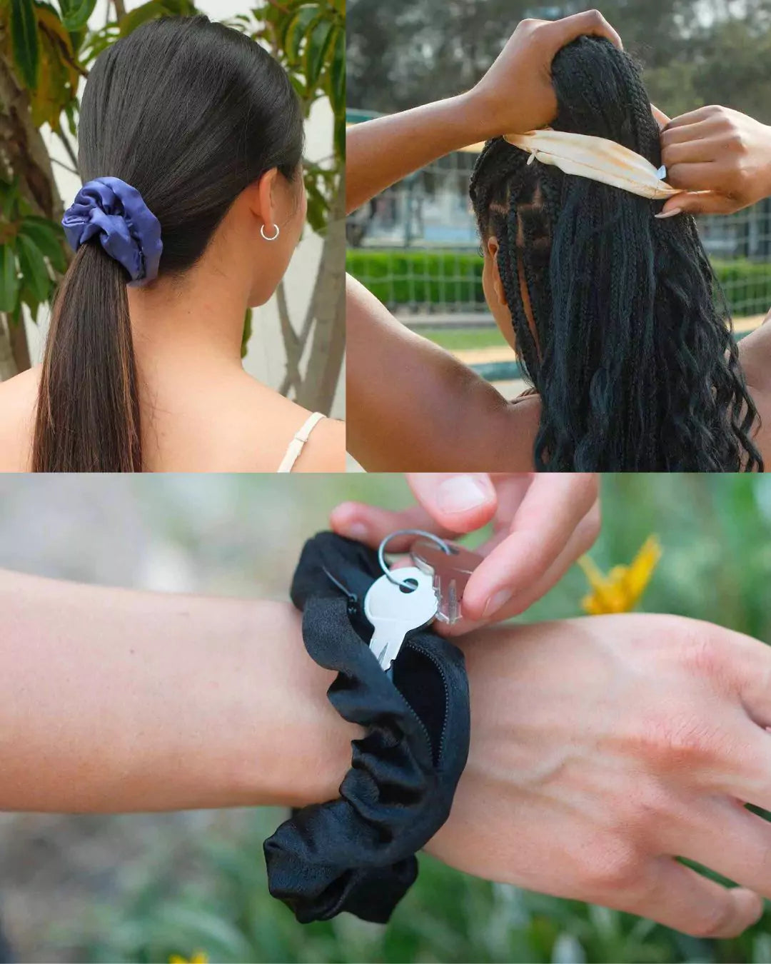 A Smunchy is a new kind of scrunchie that has a pocket inside. It features a discreet zipper to keep the pocket hidden. It is perfect for keeping keys, money, AirPods, or any valuables safe while at the gym, on a run, or at a festival!